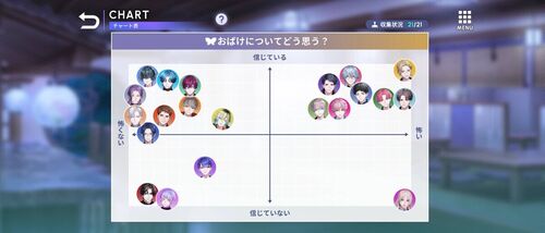 前回のイベント。 新しく導入されたチャート機能。 スタンプはもちろんコンプしました。 意外とおばけを信じてるスタッフが多くてびっくり。 でもこうして並べてみたらすごく納得。 でも新名有は信じても信じてなくもないと思うかな。 1.5周年記念ガチャ。 2…
